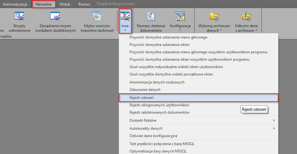 - Kliknij przycisk Inne, a następnie z rozwijanej listy wybierz Rejestr zdarzeń