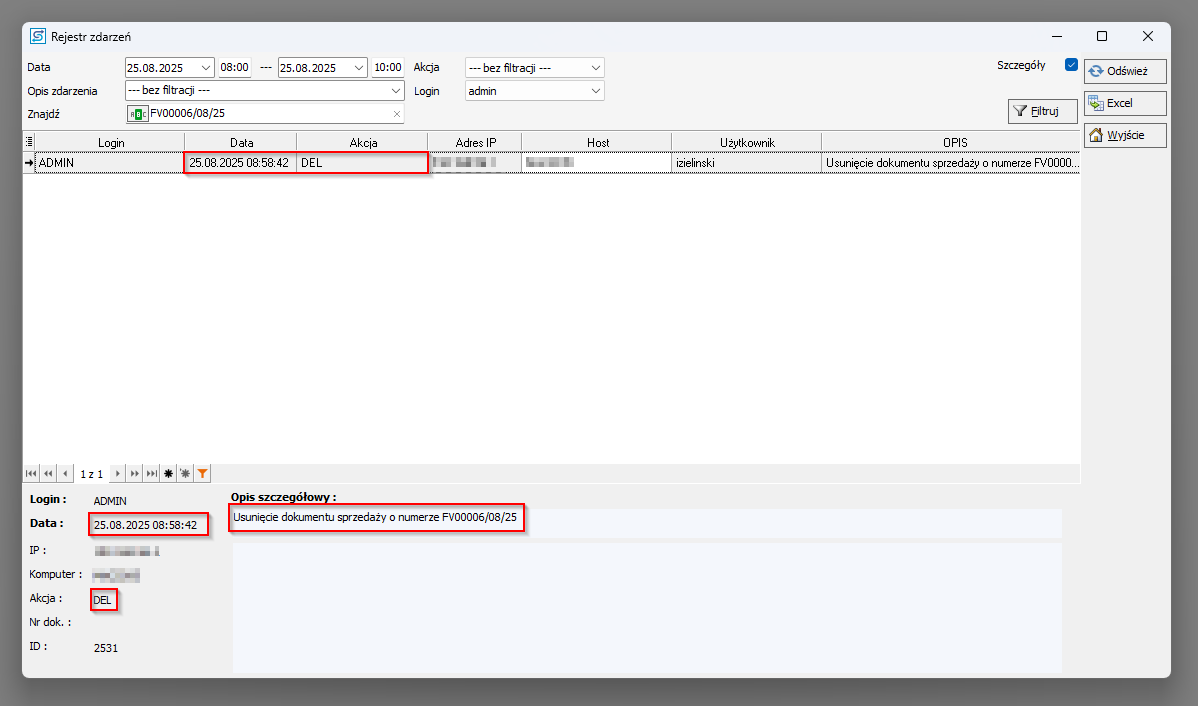 W SPEDTRANS znajduje się Rejestr zdarzeń, który pozwala śledzić wszystkie działania w programie, w tym wprowadzanie i modyfikacje danych, na przykład w przypadku usunięcia faktury umożliwia sprawdzenie, kto i kiedy ją usunął. Możesz łatwo sprawdzić co się stało z dokumentem lub kto go ostatnio modyfikował.