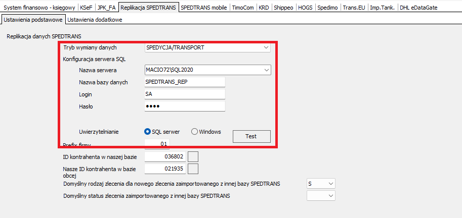 - Login i hasło do serwera MS SQL będą identyczne jak w programie spedycyjnym