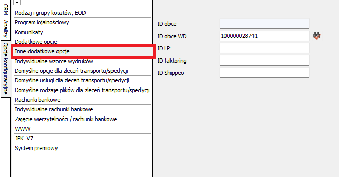 - Następnie w firmie spedycyjnej szukamy kartoteki Naszej firmy transportowej i postępujemy zgodnie z powyższymi pkt. (2-7) uzupełniamy ID obce WD w kartotece firmy transportowej