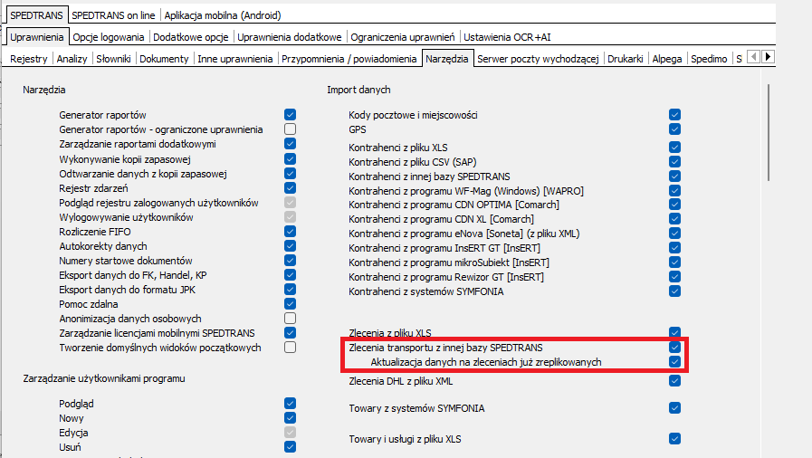- Przechodzimy ścieżkę SPEDTRANS > Uprawnienia > Narzędzia > zaznaczamy checkbox Zlecenia transportu z innej bazy SPEDTRANS i Aktualizacja danych na zleceniach już zreplikowanych