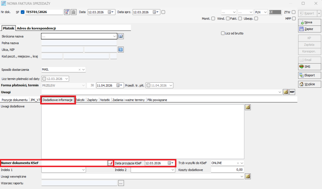 3. Otwórz zakładkę Dodatkowe informacje na dokumencie. Po włączeniu SF i dodaniu swojego numeru będą tam dostępne nowe opcje. Możesz wpisać tam numer KSeF i datę otrzymania dokumentu