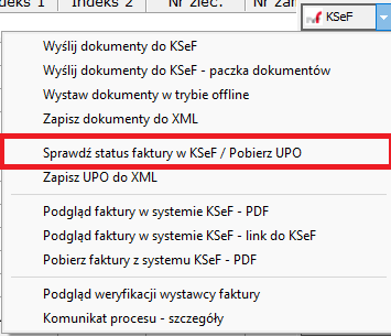 - Kliknij przycisk KSeF po prawej stronie ekranu, a następnie wybierz opcję Sprawdź status faktury w KSeF.
