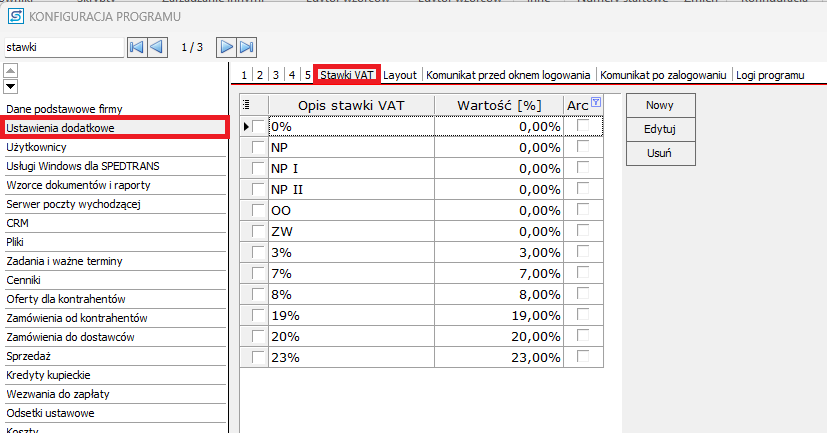 Stawki VAT określają wysokość podatku od towarów i usług, jaki należy doliczyć do ceny produktu lub usługi. W systemie można zdefiniować różne stawki, a także zwolnienia. Czasami, przy współpracy z klientami zagranicznymi, konieczne jest dodanie niestandardowej stawki VAT, zgodnej z przepisami obowiązującymi w danym kraju (na przykład 10% – Francja)