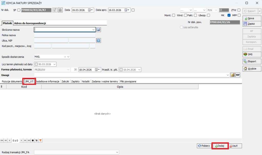 2. Przejdź do zakładki JPK_V7 i kliknij Dodaj