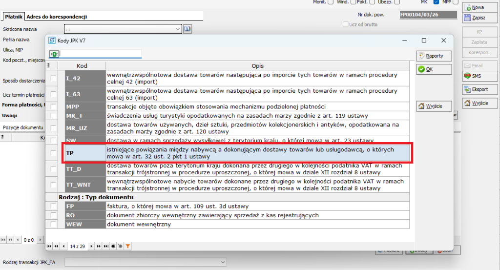 Oznaczenie TP (transakcja powiązana) służy do wskazania, że sprzedawca i nabywca są podmiotami powiązanymi w rozumieniu przepisów podatkowych.