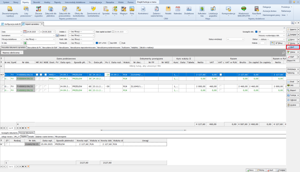 1. Przejdź do odpowiedniego Rejestru: Wybierz rejestr zawierający dokument do usunięcia, np. Rejestry > Sprzedaż dla faktur lub Rejestry > Zlecenia transportu i spedycji dla zleceń.
