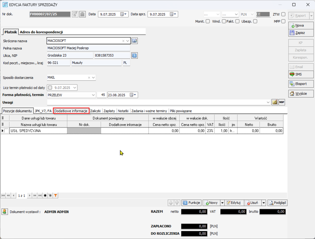 1. Podczas wystawiania nowego lub edytowania istniejącego zlecenia skorzystaj z pola “Uwagi” lub przejdź do zakładki „Dodatkowe informacje”. Pola te różnie maksymalna ilość znaków – Uwagi są bardziej ograniczone. Poniżej przykład gdzie znaleźć Dodatkowe informacje. Uwagi są widoczne od razu powyżej.