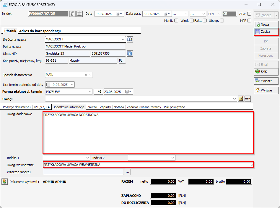 Po zapisaniu, wpisane uwagi będą widoczne na wystawionym dokumencie (jeśli dodano uwagi lub uwagi dodatkowe) lub w systemie (jeśli dodano uwagi wewnętrzne).