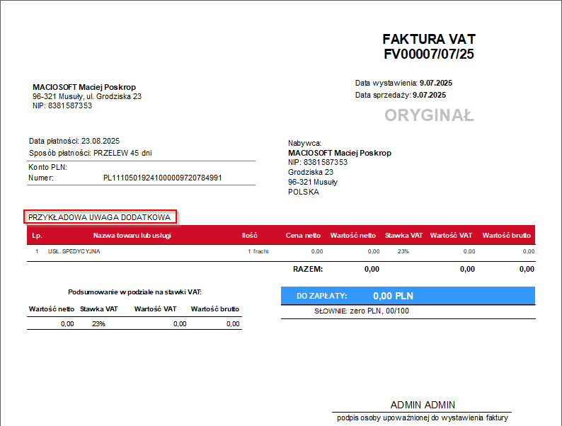 Funkcjonalność ta umożliwia dodanie uwag dodatkowych do faktury lub innego wystawianego dokumentu. Dzięki temu użytkownik zyskuje możliwość zamieszczenia indywidualnych adnotacji, komentarzy czy instrukcji, które mogą mieć znaczenie zarówno informacyjne, jak i porządkowe.
