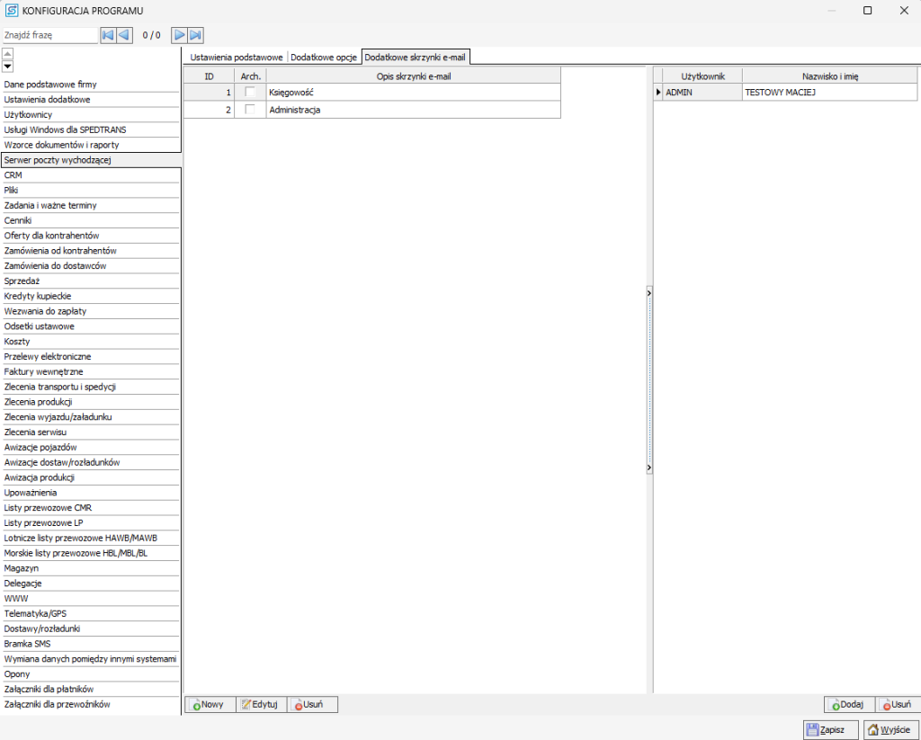 Ważne! Aby móc wybrać skrzynkę, po dodaniu jej, należy po prawej stronie określić użytkownika, który ma mieć dostęp do wyboru tej skrzynki.