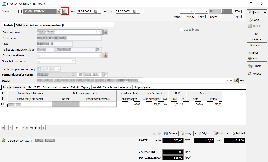 4. Wyświetli się okno, w którym można zmieniać dane dotyczące faktury. Jeśli zlecenie zostało poprawnie wypełnione, zazwyczaj nie ma potrzeby wprowadzania zmian, z wyjątkiem ewentualnych uwag.