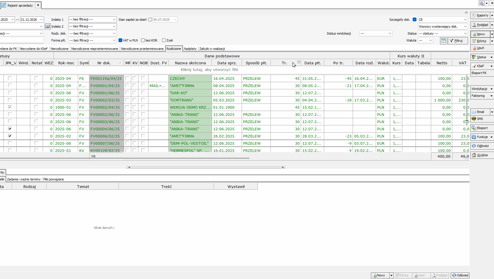 Rozwiązanie: Może to oznaczać, że faktura została skasowana – sprawdź Rejestr zdarzeń. Alternatywnie, może to być wynik błędnie ustawionych filtrów – ustaw filtrację na Datę dokumentu i wybierz szeroki zakres dat.