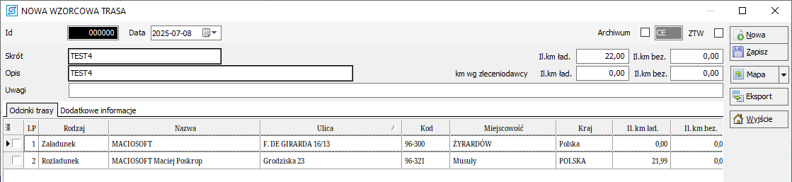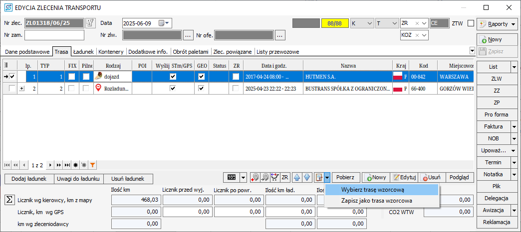- Będąc na formatce zlecenia przejdź na zakładkę trasa
