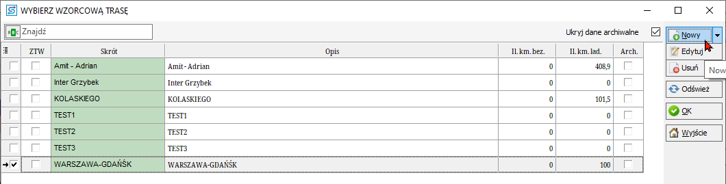 - Na formatce wyboru trasy wzorcowej wciśnij przycisk Nowy