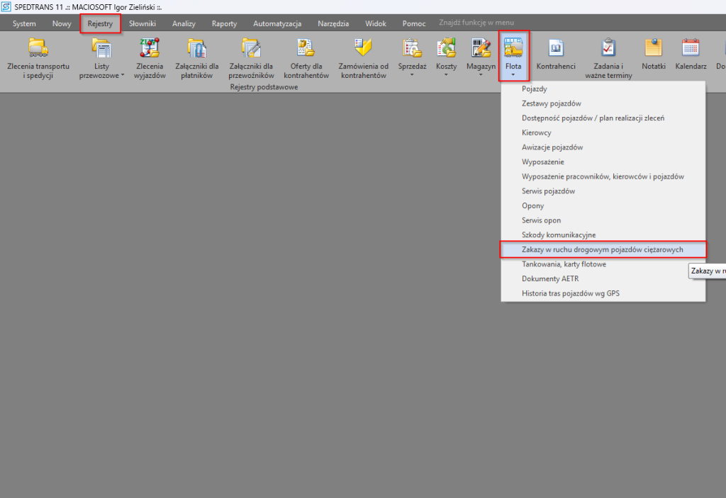 2. Wybierz pozycję Flota, a następnie z rozwijanej listy kliknij Zakazy w ruchu drogowym pojazdów ciężarowych