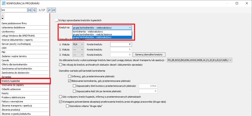 Zalecamy wdrożenie opisanej zmiany w konfiguracji programu SPEDTRANS. Nowy metoda naliczania została w pełni zoptymalizowana pod kątem działania programu. Zmiana dla użytkownika wiążę się tylko z wybraniem innej opcji w konfiguracji kredytu kupieckiego – sugerujemy wykonanie archiwum kopii zapasowej bazy danych przez wykonaniem tego kroku.