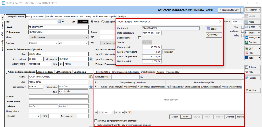 Kontrolka Kredytobiorca pozwala na wykorzystanie linii kredytowych wybranego kontrahenta.