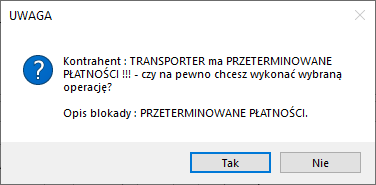 Po zapisaniu dokumentu pojawi się komunikat o ewentualnych opóźnieniach w płatnościach. - Blokowanie kontrahenta, gdy są przeterminowane płatności. Blokuje możliwość wystawienia zlecenia, jeśli kontrahent ma przeterminowane płatności.