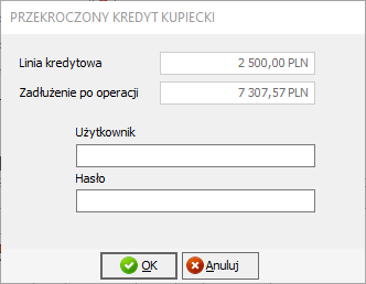 Daje użytkownikowi możliwość akceptacji przekroczenia kredytu