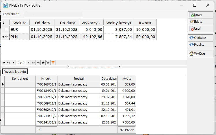 - Przeliczenie wykorzystanego kredytu kupieckiego we wszystkich walutach do waluty bazowej PLN.